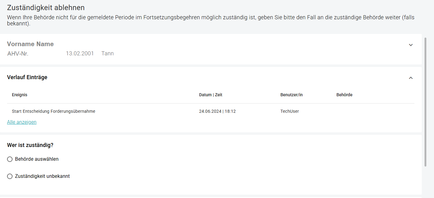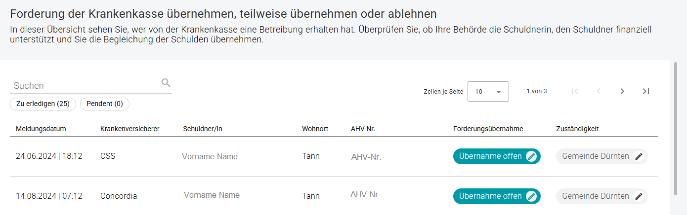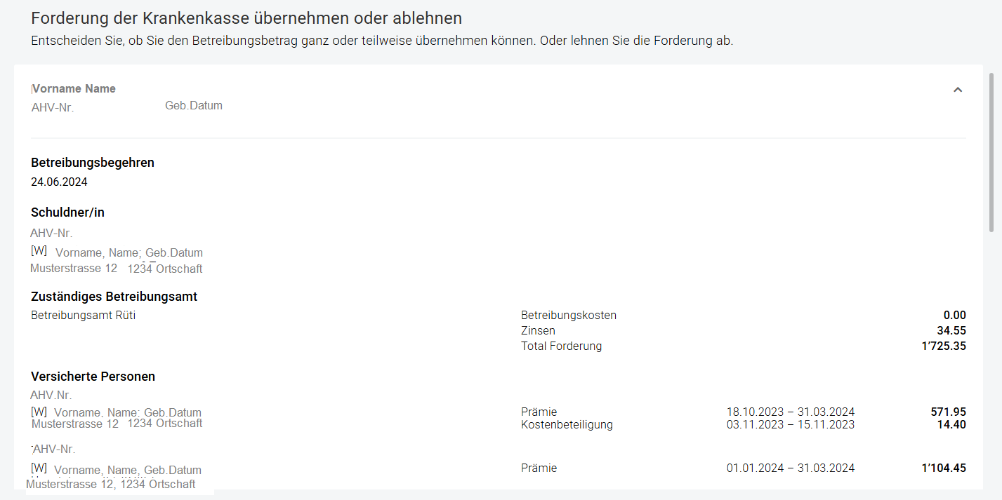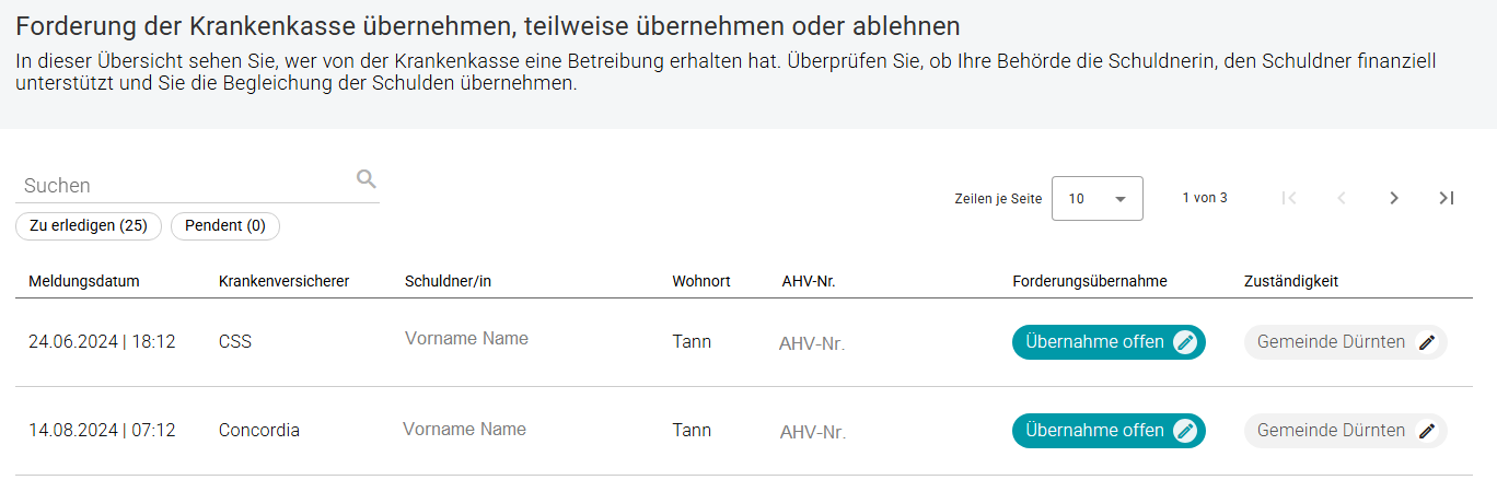 In dieser Rubrik entscheiden Sie über die Betreibungsforderungen. Hinweis, wenn Sozialhilfe-Zeitraum nicht mit der Forderung übereinstimmt: Bitte lehnen Sie in diesen Fällen die Meldung ab, nicht die Zuständigkeit. Die Zuständigkeit sollte nur abgelehnt werden, wenn Ihre Gemeinde oder Ihr Sozialdienst nicht für die Person zuständig ist.