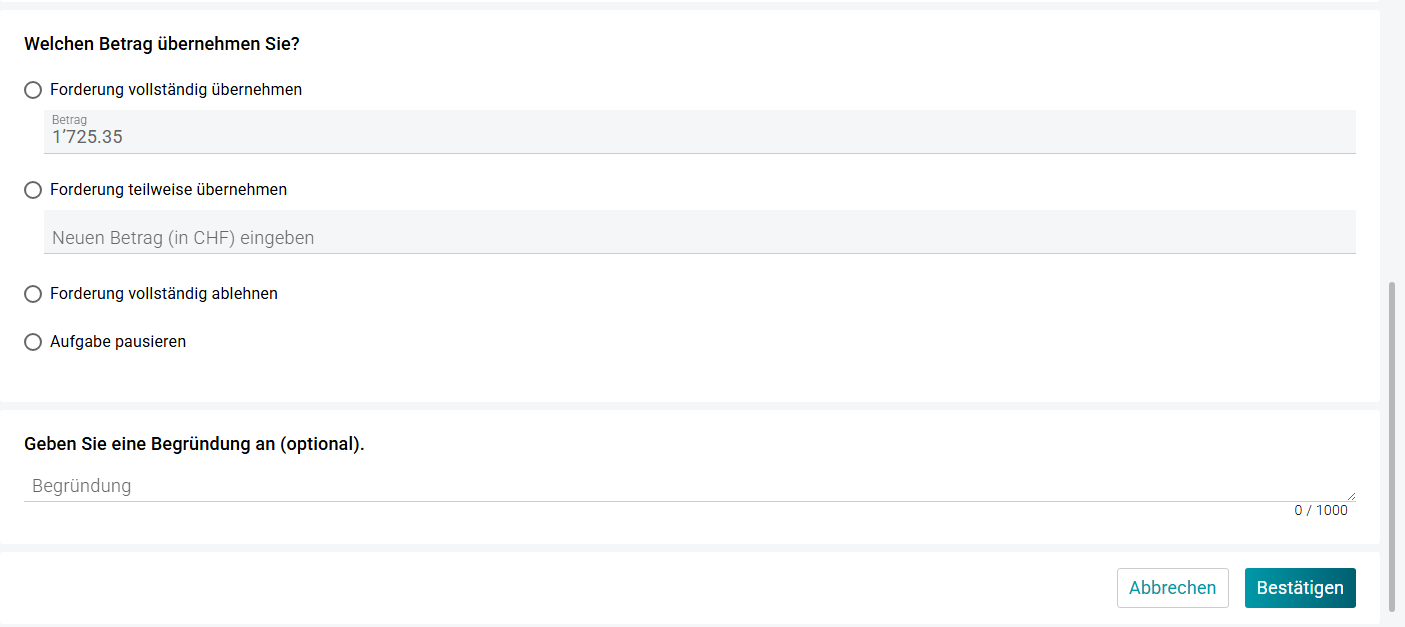 3. Sie haben nun die Möglichkeit, den Betrag vollständig oder nur einen Teil zu übernehmen. Oder sie können die Forderung vollständig ablehnen. Mit Klick auf «Bestätigen» ist die Aufgabe erledigt.